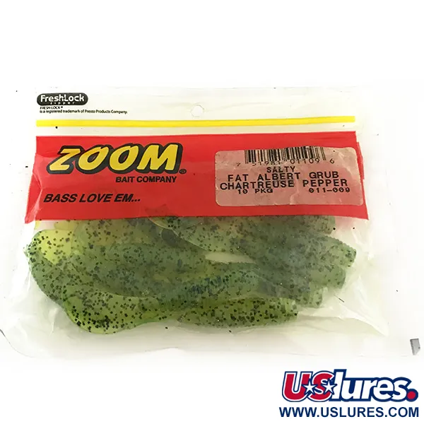 Chartreuse Pepper è il colore di punta di questi esemplari, caratterizzato da una base verde traslucida ad alta visibilità carica di sottili glitter neri. Con una lunghezza di 3 1/4" (8,25 cm), questi soft plastic rappresentano un design fondamentale della Zoom Bait Company di Watkinsville, Georgia. Il profilo del Fat Albert è caratterizzato da un corpo tozzo e pesantemente anellato che termina in una coda a falce sottile dal profilo largo. Questa confezione specifica, identificata dal codice prodotto 6678, contiene 10 esche inutilizzate nella loro busta originale con chiusura a pressione. La struttura anellata sul busto è una scelta costruttiva deliberata per aumentare la superficie, una caratteristica comune nelle esche siliconiche prodotte negli Stati Uniti per il jigging. Ogni grub di questo lotto mostra una saturazione del colore e una distribuzione dei glitter uniformi su tutti gli 8,25 cm di lunghezza. La confezione è integra, con la classica banda rossa superiore e i dettagli dell'indirizzo del produttore.